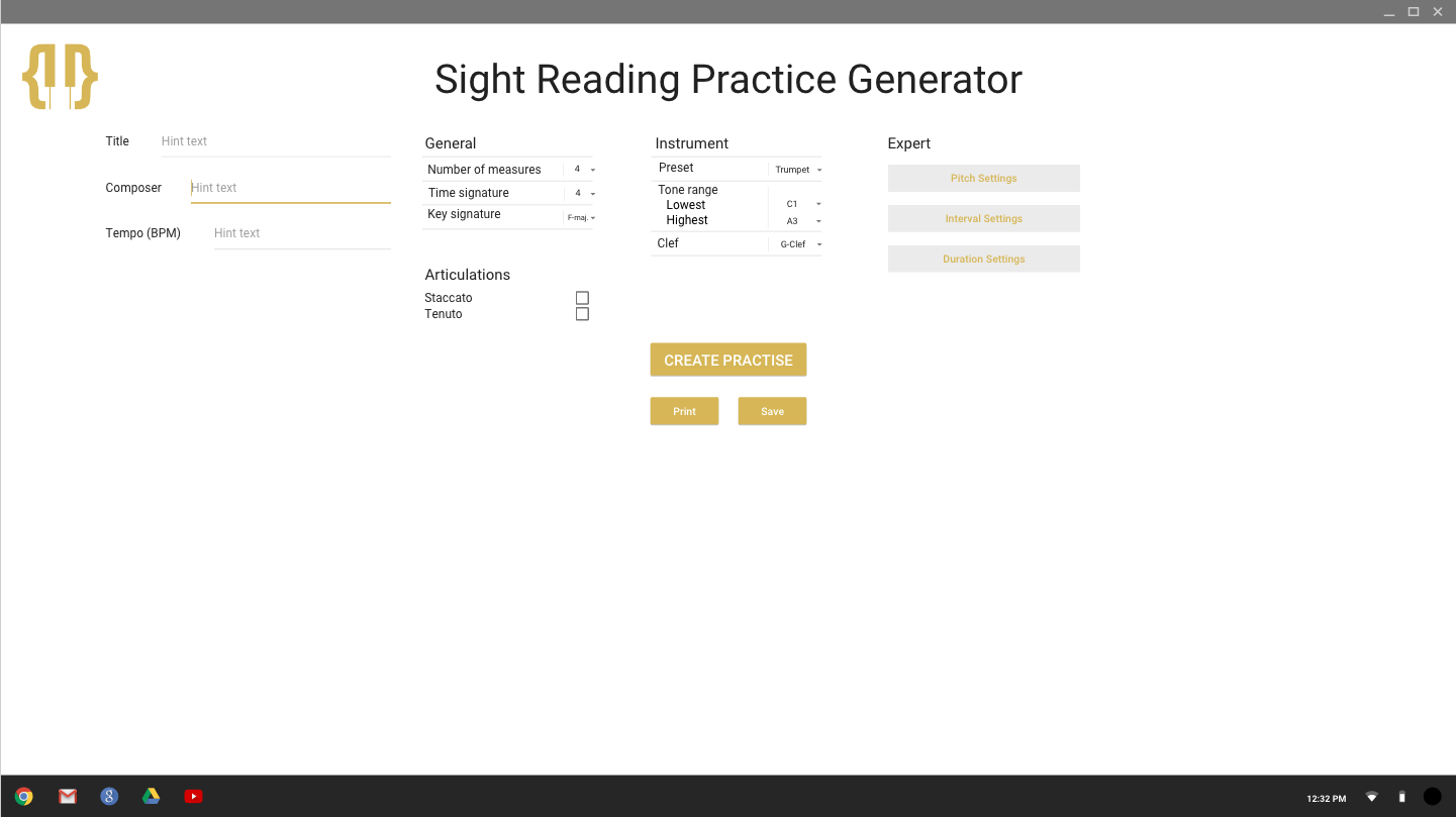 Once you are happy with all your preferences, the exercises are generated at the touch of a button and displayed on the screen using Open Sheet Music Display (OSMD). The exercises on display can then be saved or printed by the musicians. This simple process can then be repeated over and over again.