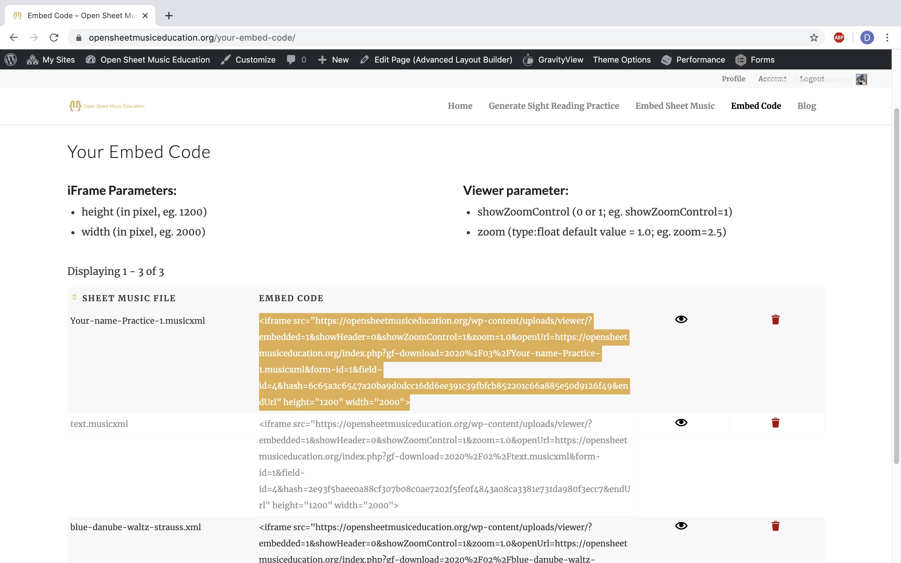 - Publish the page/post and preview your MusicXML file